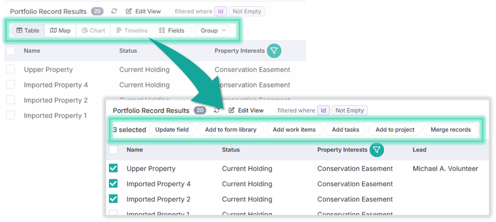 All result display options now show at the top of the results list. When you select results, you’ll immediately see available actions (like updating fields, adding time tracking, merging records, etc.). This small change adds a big boost to efficiency.
